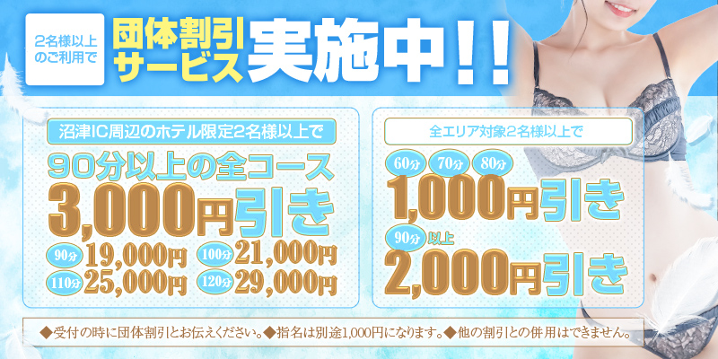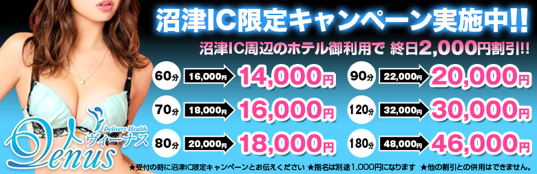 ★☆【業界未経験】【可愛い美少女】【素人系美少女】多数在籍 ☆★ 一生懸命な女の子ばかりです! トップレベルのルックスとサービスを肌で感じて下さい。 写真は全て本人撮影、ダミーは一切ありません! 【ヴィーナス】のような美少女と極上のひとときをご堪能下さい。 各種イベント実施中♪ ◆沼津IC限定キャンペーン実施中 ⇒ 沼津IC周辺ホテルご利用で2,000円引き! ◆沼津駅北口周辺割引 ⇒ 1,000円引き! ◆団体様割引 ⇒ 2名様以上で1,000~3,000円引き! ★各種イベントの詳細はイベントニュースをチェックしてね!!